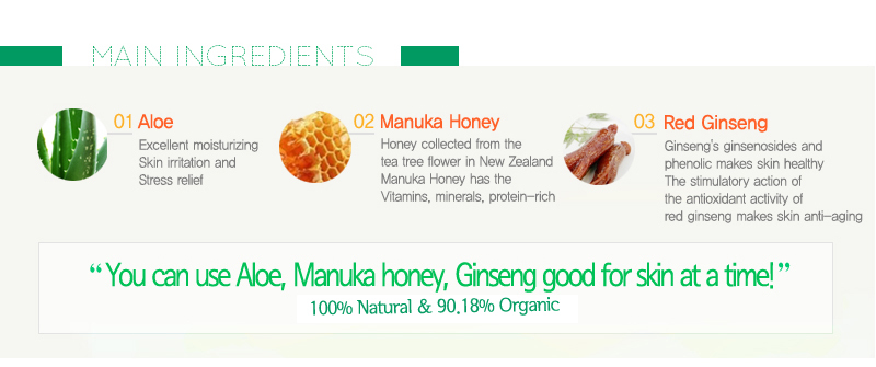Main Ingredients Aloe, Manuka honey, Korean red ginseng,100% Natural, 90.18% OrganicSkin type for all skin